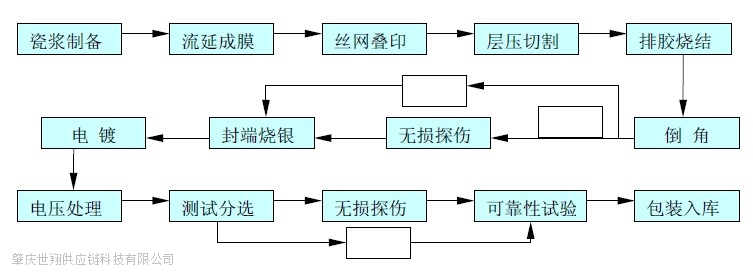 因此,多层片式陶瓷电容器的结构主要包括三大部分:陶瓷介质,金属内电极,金属外电极。而多层片式陶瓷电容器它是一个多层叠合的结构,简单地说它是由多个简单平行板电容器的并联体。 独石电容的生产工艺流程 我国自八十年代从美国引进独石电容的生产线以来,至今已有十多年的生产经验。在生产工艺的某些方面,比如低烧独石电容器的生产、研究,已取得了不小的成绩。介质层数在150层以下的常规产品的电性能及可靠性,已和世界先进国家的水平相差无几。只是在更高层数、更高耐压、高可靠的产品性能方面同世界先进国家还存在一定的差距。 独石电容的整个生产工艺过程是一个十分复杂的过程,其对生产环境,生产设备的精度,原材料的选取都有十分苛刻的要求,我们流延成膜和丝网印刷工作间的洁净度一般控制在3000左右,世界级水平。 独石电容生产工艺流程:
